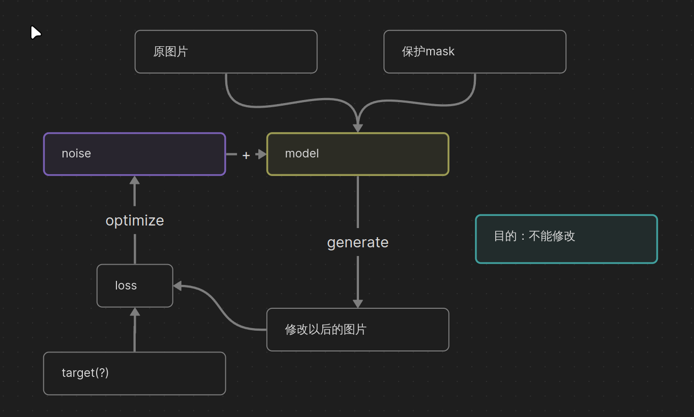 整体过程:对于给定的模型,根据原始图片和修改的mask,计算模型修改加了noise以后的修改结果和target之间的均方误差,然后更新noise来达到对抗修改的效果